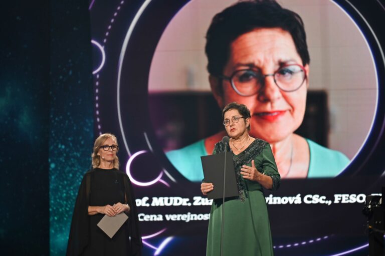 Laureátka ocenenia Cena verejnosti, neurologička Zuzana Gdovinová (vpravo) počas slávnostného vyhlásenia laureátov ocenenia výnimočných vedeckých osobností ESET Science Award v priestoroch Slovenskej filharmónie. Bratislava, 9. október 2025. Foto: SITA/ESET Science Award/Linda Kisková Bohušová