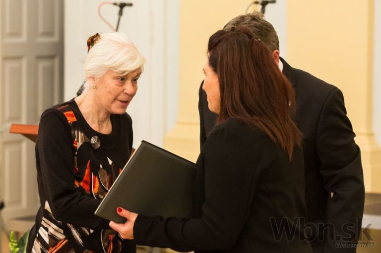 Alžbeta Petoová, dcéra ocenených (Arpád a Alžbeta Hajdu) si preberá ocenenie počas odovzdávania ocenení Spravodliví medzi národmi. Bratislava, 28. január 2015. Foto: SITA/Jozef Jakubčo