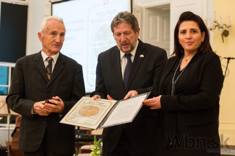 Zľava: Karol Kršák, syn oceneného (Imrich Kršák), veľvyslanec Štátu Izrael v SR Alexander Ben-Zvi a konzulka Štátu Izrael v SR Avital Gershon počas odovzdávania ocenení Spravodliví medzi národmi. Bratislava, 28. január 2015. Foto: SITA/Jozef Jakubčo