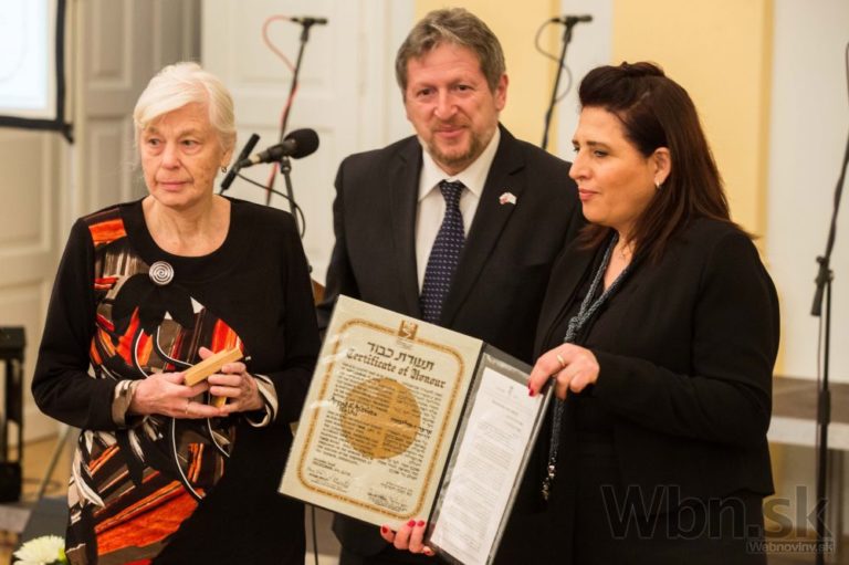 Zľava: Alžbeta Petoová, dcéra ocenených (Arpád a Alžbeta Hajdu), veľvyslanec Štátu Izrael v SR Alexander Ben-Zvi a konzulka Štátu Izrael v SR Avital Gershon počas odovzdávania ocenení Spravodliví medzi národmi. Bratislava, 28. január 2015. Foto: SITA/Jozef Jakubčo