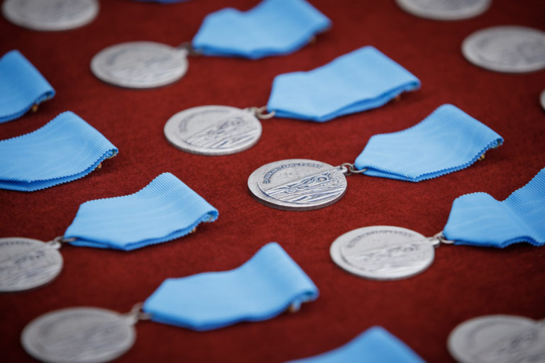 Pohľad na medaily počas ocenenia profesionálnych vojakov a zamestnancov, ktorí sa podieľali na evakuácii občanov a spolupracovníkov Slovenskej republiky z Afganistanu. Bratislava, 24. august 2021. Foto: SITA/Branislav Bibel