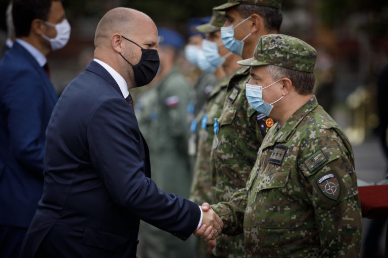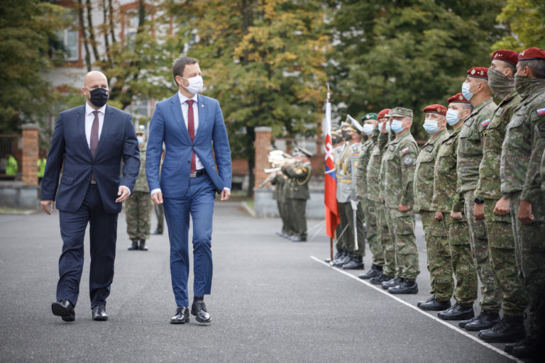Zľava: Minister obrany SR Jaroslav Naï a predseda vlády SR Eduard Heger počas ocenenia profesionálnych vojakov a zamestnancov, ktorí sa podieľali na evakuácii občanov a spolupracovníkov Slovenskej republiky z Afganistanu. Bratislava, 24. august 2021. Foto: SITA/Branislav Bibel