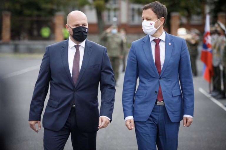 Zľava: Predseda vlády SR Eduard Heger a minister obrany SR Jaroslav Naï počas ocenenia profesionálnych vojakov a zamestnancov, ktorí sa podieľali na evakuácii občanov a spolupracovníkov Slovenskej republiky z Afganistanu. Bratislava, 24. august 2021. Foto: SITA/Branislav Bibel