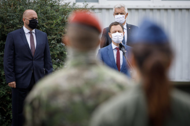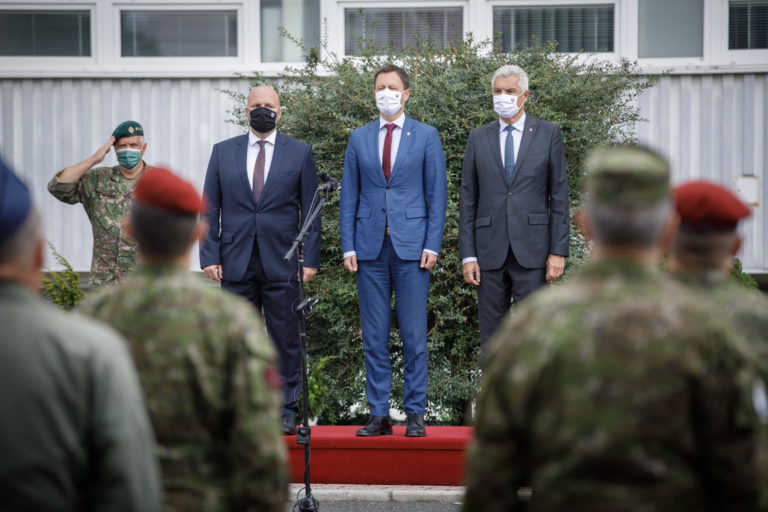 Zľava: Minister obrany SR Jaroslav Naï, predseda vlády SR Eduard Heger a minister zahraničných vecí a európskych záležitostí SR Ivan Korčok počas ocenenia profesionálnych vojakov a zamestnancov, ktorí sa podieľali na evakuácii občanov a spolupracovníkov Slovenskej republiky z Afganistanu. Bratislava, 24. august 2021. Foto: SITA/Branislav Bibel