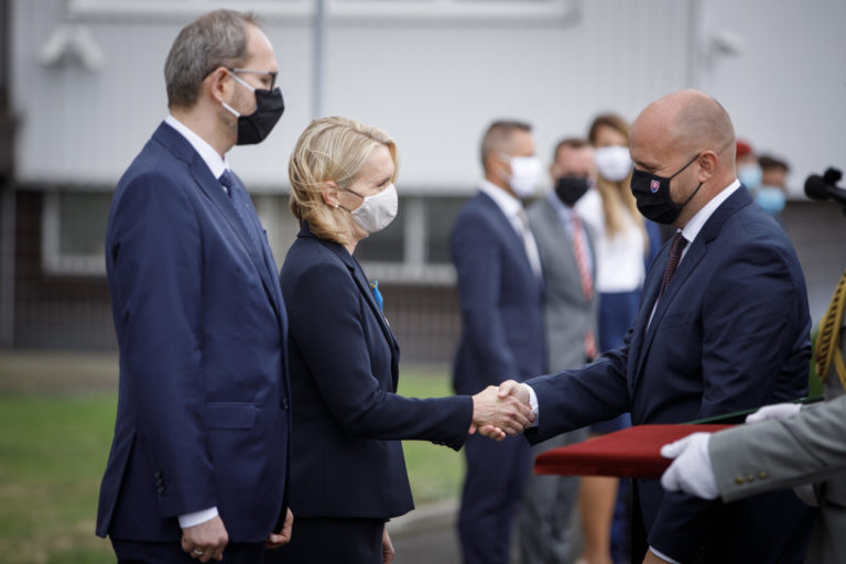 Zľava: Veľvyslanec pri NATO Peter Bátor, veľvyslankyňa USA na Slovensku Bridget Brink a minister obrany SR Jaroslav Naï počas ocenenia profesionálnych vojakov a zamestnancov, ktorí sa podieľali na evakuácii občanov a spolupracovníkov Slovenskej republiky z Afganistanu. Bratislava, 24. august 2021. Foto: SITA/Branislav Bibel