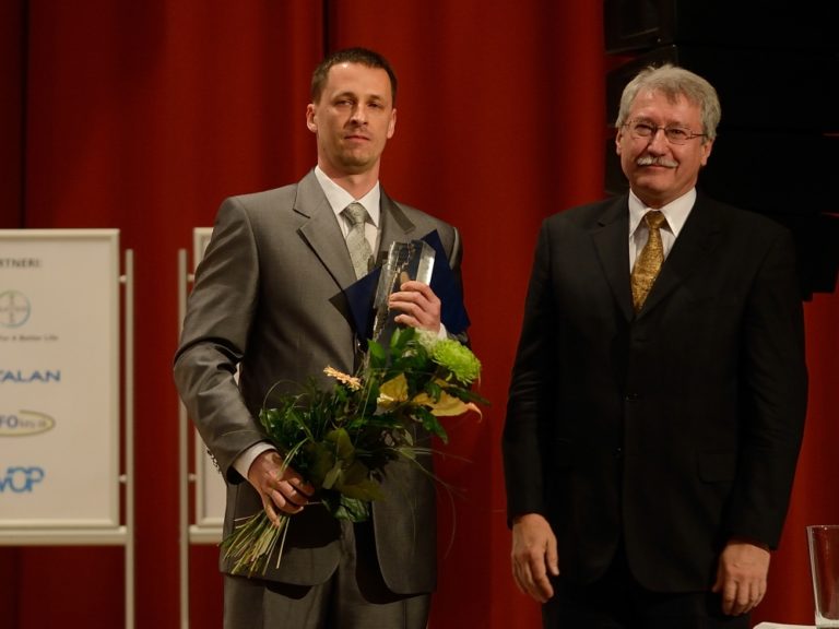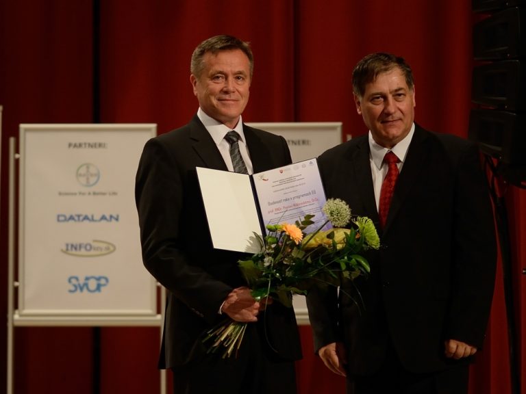 Zľava: Pavol Miškovský z Prírodovedeckej fakulty Univerzity Pavla Jozefa Šafárika v Košiciach a generálny riaditeľ CVTI SR Ján Turňa počas vyhlásenia výsledkov 18. ročníka súťaže slovenských vedcov, technológov a mladých výskumníkov zo všetkých oblastí vedy. (Bratislava, 12. máj 2015) Foto: SITA/Robert Tappert