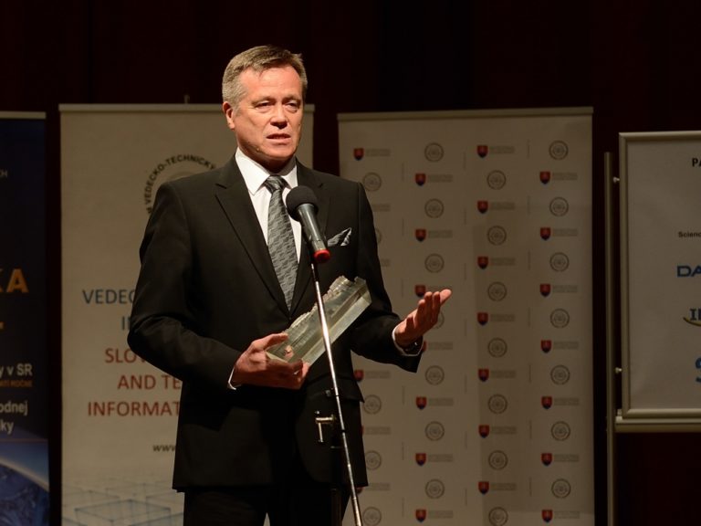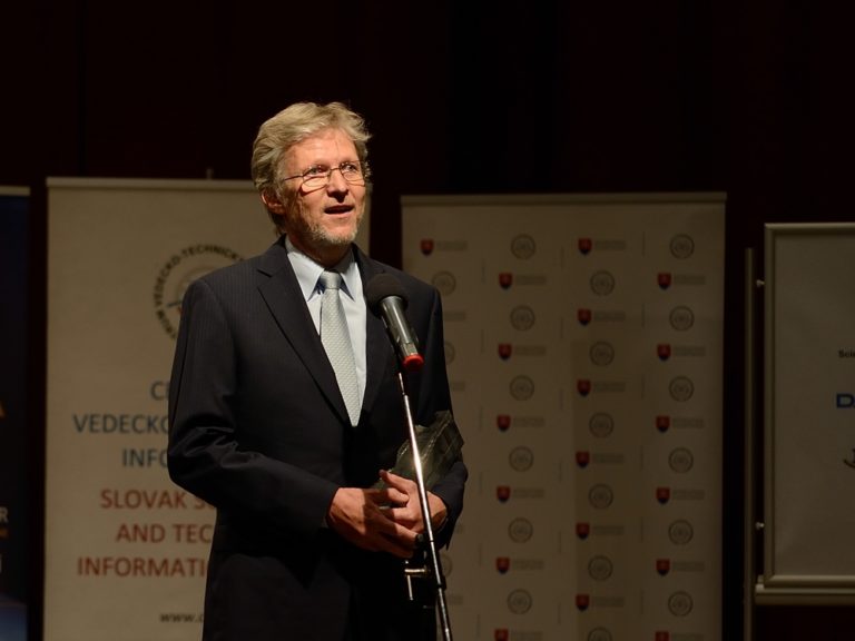Sergej Hloch z FVT TUKE počas vyhlásenia výsledkov 18. ročníka súťaže slovenských vedcov, technológov a mladých výskumníkov zo všetkých oblastí vedy. (Bratislava, 12. máj 2015) Foto: SITA/Robert Tappert