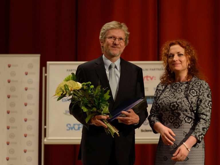 Zľava: Fedor Gömöry z Elektrotechnického ústavu SAV a štátna tajomníčka MŠ SR Romana Kanovská počas vyhlásenia výsledkov 18. ročníka súťaže slovenských vedcov, technológov a mladých výskumníkov zo všetkých oblastí vedy. (Bratislava, 12. máj 2015) Foto: SITA/Robert Tappert