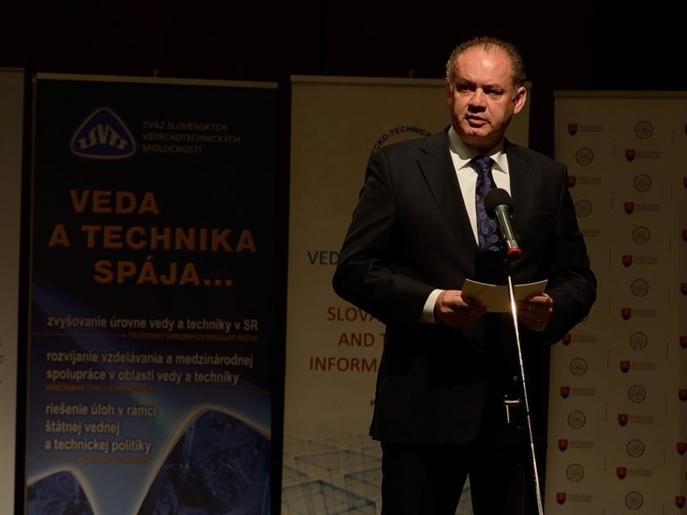 Prezident SR Andrej Kiska počas vyhlásenia výsledkov 18. ročníka súťaže slovenských vedcov, technológov a mladých výskumníkov zo všetkých oblastí vedy. (Bratislava, 12. máj 2015) Foto: SITA/Robert Tappert