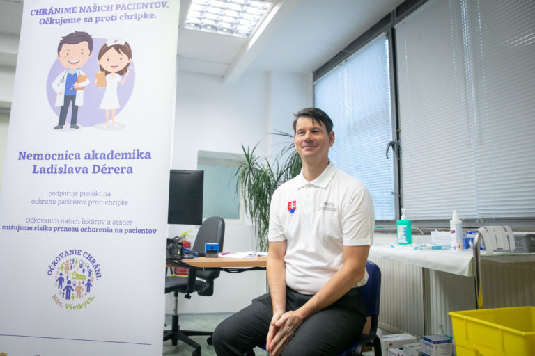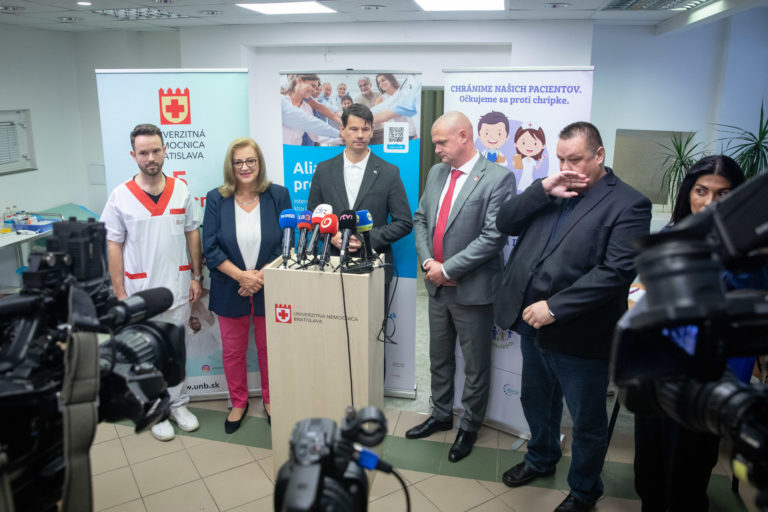 Lekár Kliniky infektológie a geografickej medicíny LFUK, SZU a UNB Peter Sabaka (vľavo) počas očkovania proti chrípke po brífingu Univerzitnej nemocnice Bratislava (UNB) na Kramároch. Bratislava, 10. október 2023. Foto: SITA/Diana Černak.