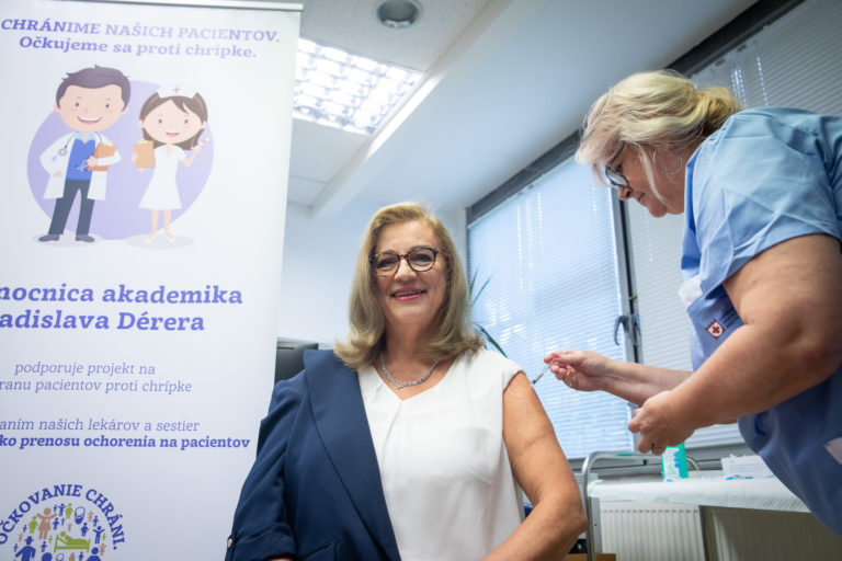 Epidemiologička Zuzana Krištúfková (vľavo) počas očkovania proti chrípke po brífingu Univerzitnej nemocnice Bratislava (UNB) v očkovacom centre na Kramároch. Bratislava, 10. október 2023. Foto: SITA/Diana Černak.