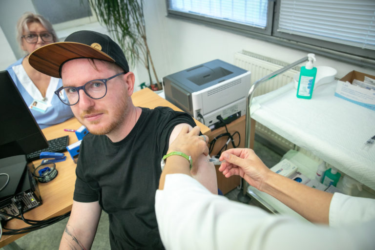 Minister zdravotníctva Michal Palkovič počas očkovania proti chrípke po brífingu Univerzitnej nemocnice Bratislava (UNB) v očkovacom centre na Kramároch. Bratislava, 10. október 2023. Foto: SITA/Diana Černak.