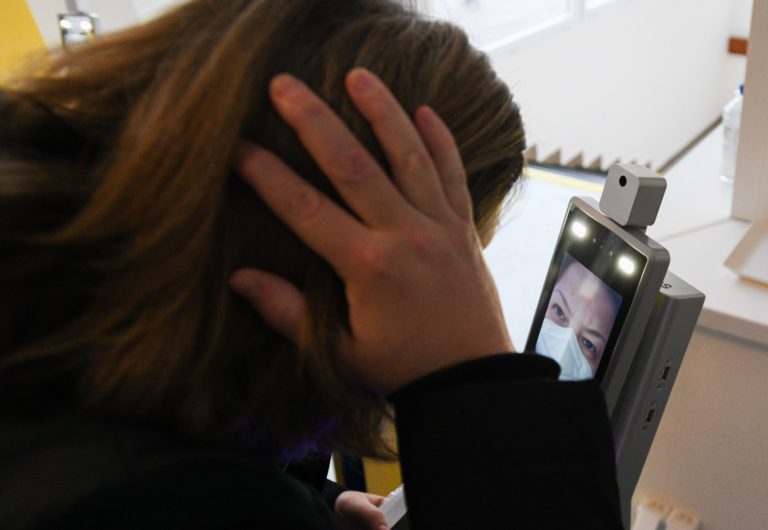 Meranie teploty pri príchode do novootvoreného veľkokapacitného očkovacieho centra v priestoroch Strednej zdravotníckej školy v Trnave počas vakcinovania pedagogických zamestnancov všetkých škôl pôsobiacich v Trnavskom kraji na prevenciu ochorenia COVID-19. Trnava, 20. február 2021. SITA/Martin Medňanský