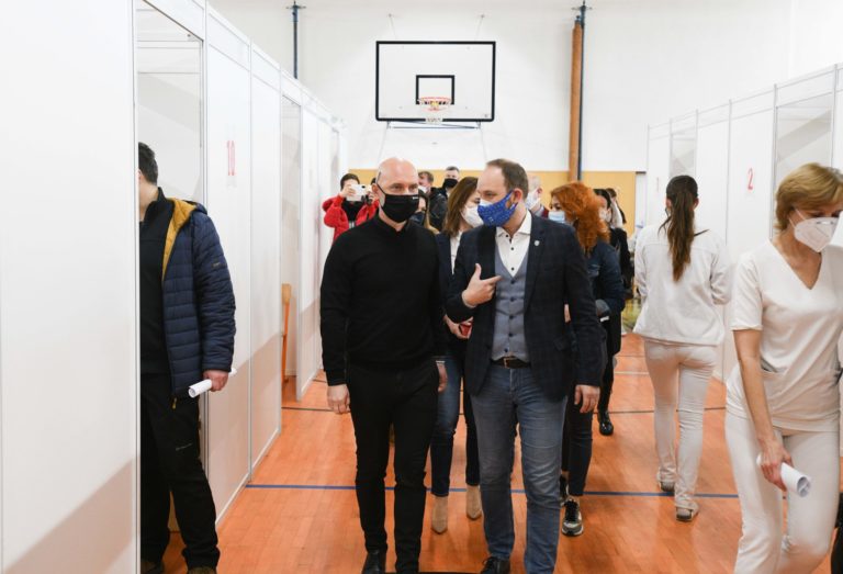 Uprostred sprava: Predseda Trnavského samosprávneho kraja Jozef Viskupič a minister školstva, vedy, výskumu a športu SR Branislav Gröhling počas prehliadky novootvoreného veľkokapacitného očkovacieho centra v priestoroch Strednej zdravotníckej školy v Trnave v Trnave pri príležitosti očkovania pedagogických zamestnancov všetkých škôl pôsobiacich v Trnavskom kraji na prevenciu ochorenia COVID-19. Trnava, 20. február 2021. SITA/Martin Medňanský