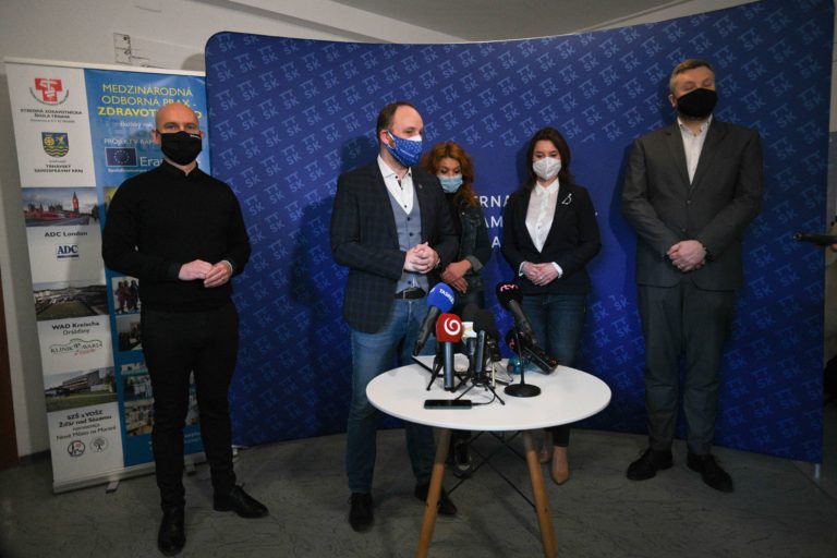 Zľava: Minister školstva, vedy, výskumu a športu SR Branislav Gröhling, predseda Trnavského samosprávneho kraja (TTSK) Jozef Viskupič, riadteľka odboru zdravotníctva TTSK Lucia midovičová, riaditeľka Strednej zdravotnej škole v Trnave Katarína Hrašnová a riaditeľ Fakultnej nemocnice v Trnave Vladislav rojta počas brífingu v rámci začatia vakcinovania pedagogických zamestnancov všetkých škôl pôsobiacich v Trnavskom kraji na prevenciu ochorenia COVID-19 v novootvorenom veľkokapacitnom očkovacom centre v priestoroch Strednej zdravotnej školy v Trnave. Trnava, 20. február 2021. SITA/Martin Medňanský