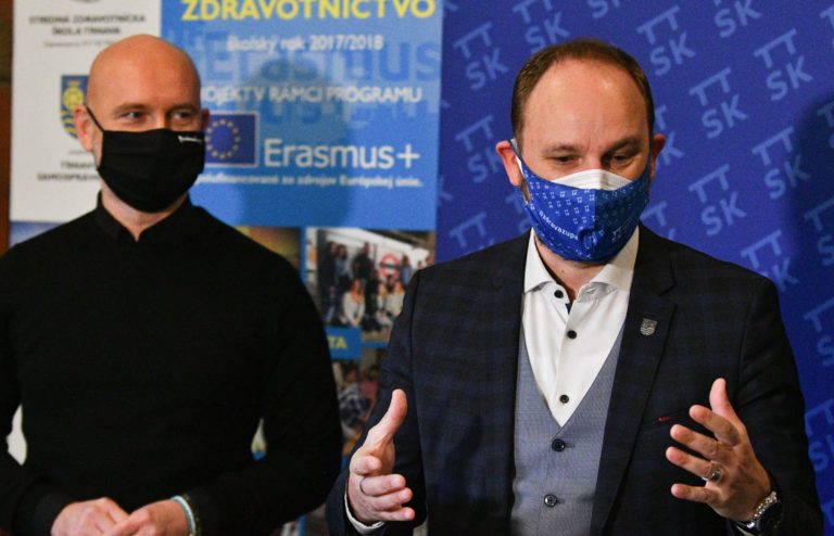 Sprava: Predseda Trnavského samosprávneho kraja (TTSK) Jozef Viskupič a minister školstva, vedy, výskumu a športu SR Branislav Gröhling počas brífingu v rámci začatia vakcinovania pedagogických zamestnancov všetkých škôl pôsobiacich v Trnavskom kraji na prevenciu ochorenia COVID-19 v novootvorenom veľkokapacitnom očkovacom centre v priestoroch Strednej zdravotníckej školy v Trnave. Trnava, 20. február 2021. SITA/Martin Medňanský