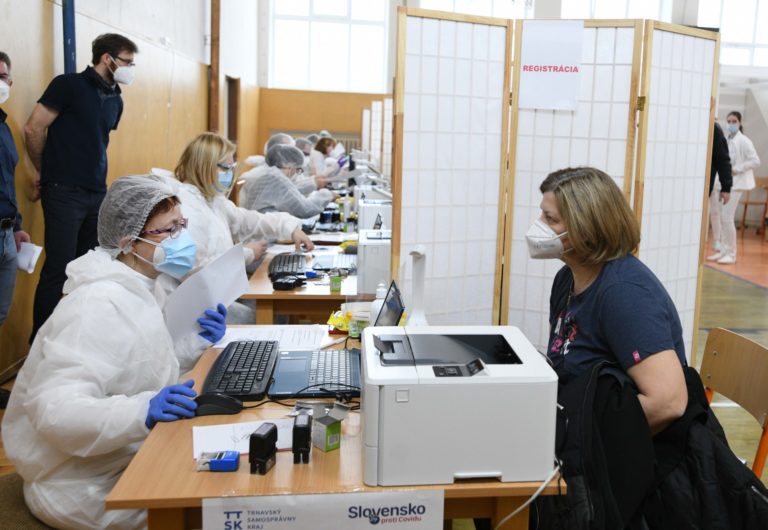 Vakcinovanie pedagogických zamestnancov všetkých škôl pôsobiacich v Trnavskom kraji na prevenciu ochorenia COVID-19 v novootvorenom veľkokapacitnom očkovacom centre v priestoroch Strednej zdravotníckej školy v Trnave. Trnava, 20. február 2021. Foto: SITA/Martin Medňanský