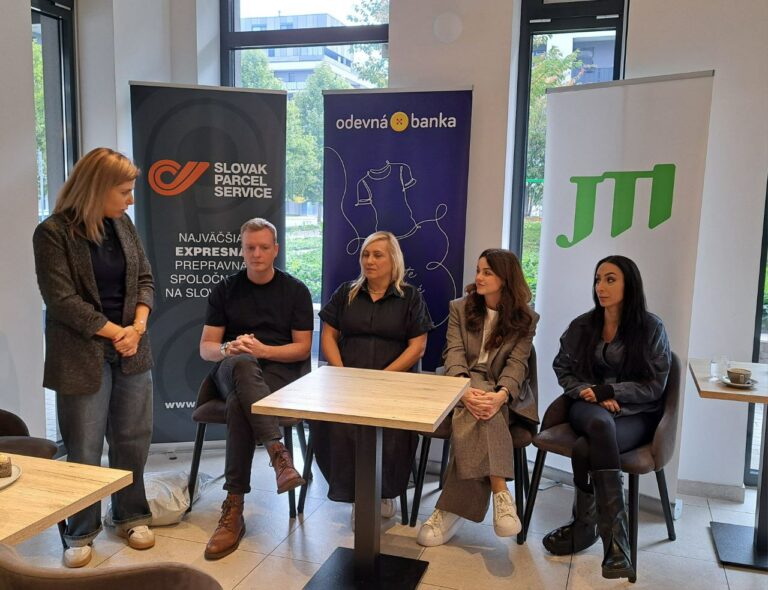 Zľava: Ondrej Gallo z Nádácie pre deti Slovenska, Eva Poprocká zo Slovak Parcel Service, Lýdia Valentová z JTI Slovak Republic, Magdaléna Polakovič - zamestnankyňa Odevnej banky. Foto: SITA/Slávka Ambrová