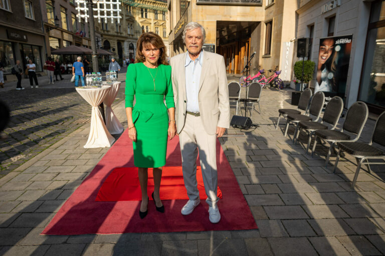Zľava uprostred: Herec Juraj Kukura a organizátorka Filmového chodníka slávy Mária Reháková počas slávnostného odhalenia dlaždice Jurajovi Kukurovi na Filmovom chodníku slávy pred Divadlom P. O. Hviezdoslava v Bratislave. Bratislava, 19. september 2024. Foto: SITA/Jana Birošová
