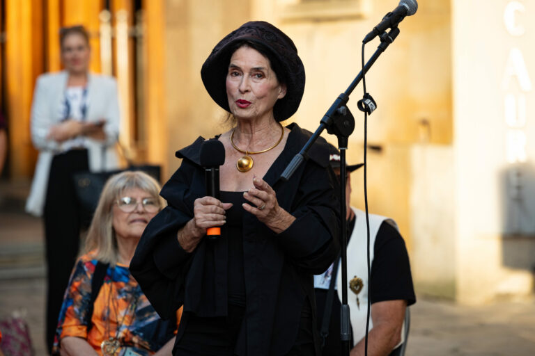Herečka Zuzana Kocúriková počas slávnostného odhalenia dlaždice Jurajovi Kukurovi na Filmovom chodníku slávy pred Divadlom P. O. Hviezdoslava v Bratislave. Bratislava, 19. september 2024. Foto: SITA/Jana Birošová