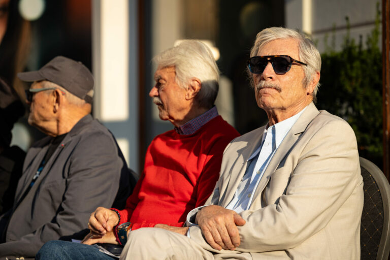 Slovenský herec a politik Milan Kňažko (uprostred) počas slávnostného odhalenia dlaždice Jurajovi Kukurovi na Filmovom chodníku slávy pred Divadlom P. O. Hviezdoslava v Bratislave. Bratislava, 19. september 2024. Foto: SITA/Jana Birošová