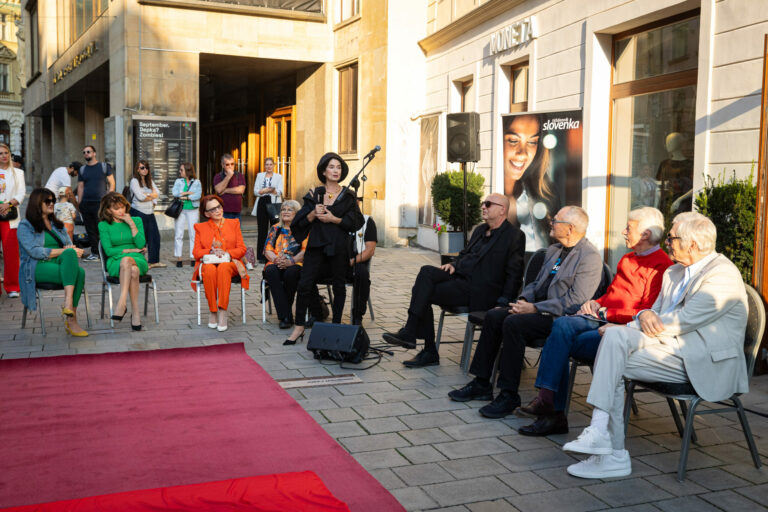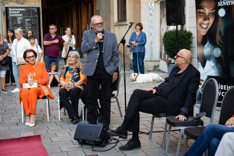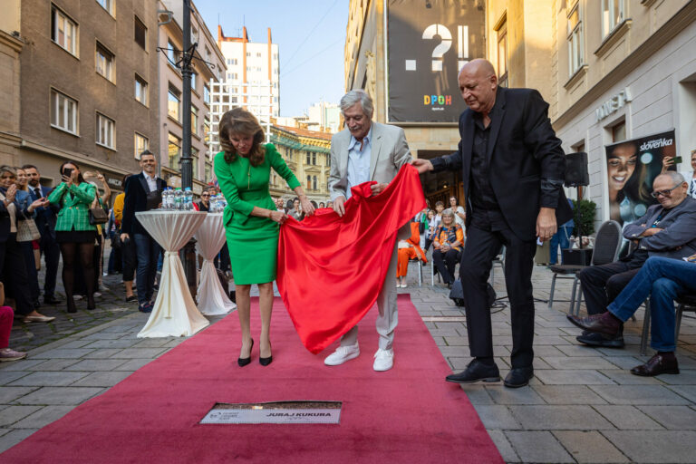 Atmosféra počas slávnostného odhalenia dlaždice Jurajovi Kukurovi na Filmovom chodníku slávy pred Divadlom P. O. Hviezdoslava v Bratislave. Bratislava, 19. september 2024. Foto: SITA/Jana Birošová