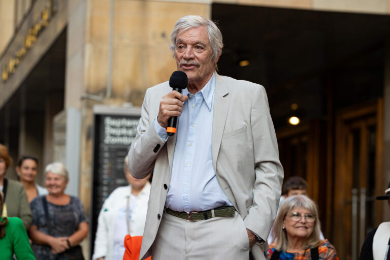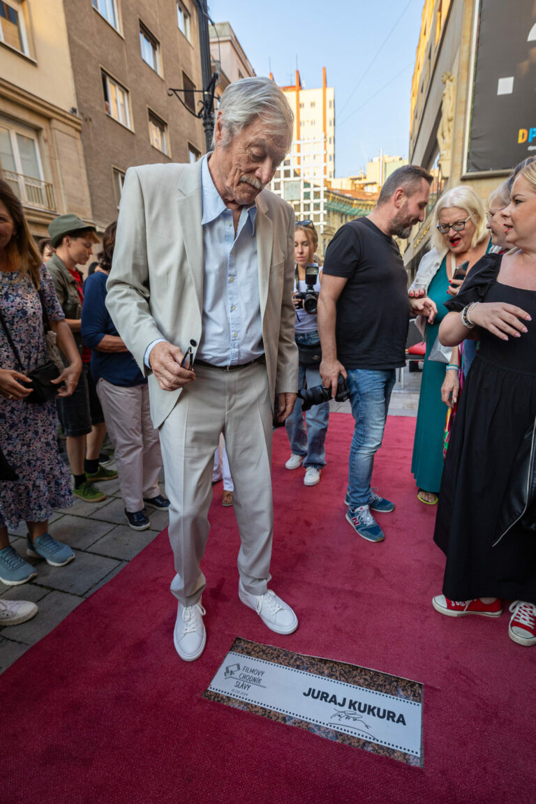 Herec Juraj Kukura počas slávnostného odhalenia dlaždice Jurajovi Kukurovi na Filmovom chodníku slávy pred Divadlom P. O. Hviezdoslava v Bratislave. Bratislava, 19. september 2024. Foto: SITA/Jana Birošová