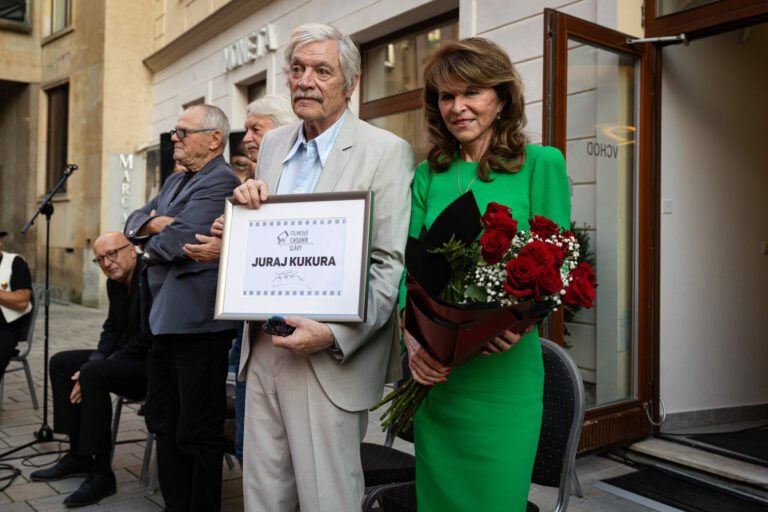Herec Juraj Kukura (vpravo) počas slávnostného odhalenia dlaždice Jurajovi Kukurovi na Filmovom chodníku slávy pred Divadlom P. O. Hviezdoslava v Bratislave. Bratislava, 19. september 2024. Foto: SITA/Jana Birošová