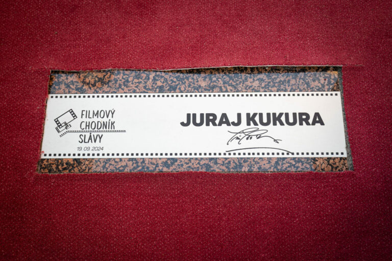Dlaždica Juraja Kukuru počas slávnostného odhalenia dlaždice Jurajovi Kukurovi na Filmovom chodníku slávy pred Divadlom P. O. Hviezdoslava v Bratislave. Bratislava, 19. september 2024. Foto: SITA/Jana Birošová