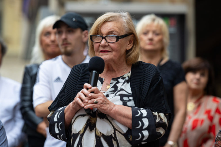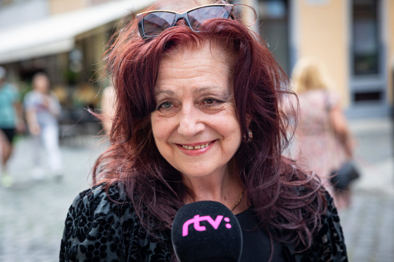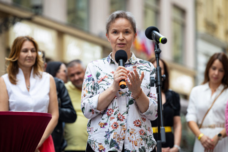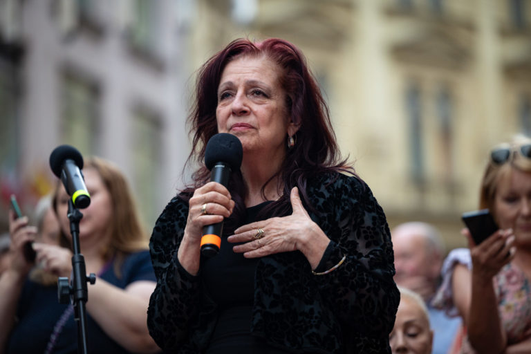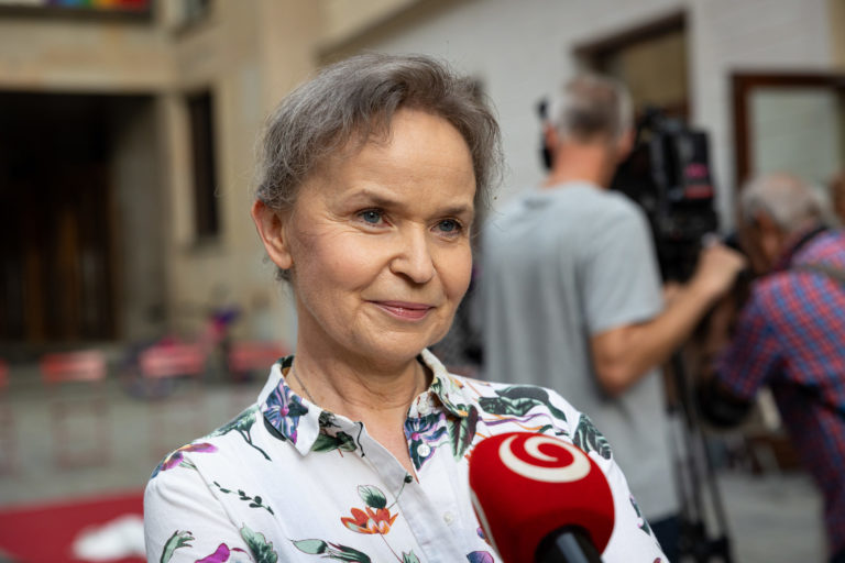 Riaditeľka vydavateľstva STAR production Mária Reháková počas slávnostného odhalenia dlaždice Jurajovi Jakubiskovi na Filmovom chodníku slávy. Bratislava, 22. september 2023. Foto: SITA/Jana Birošová