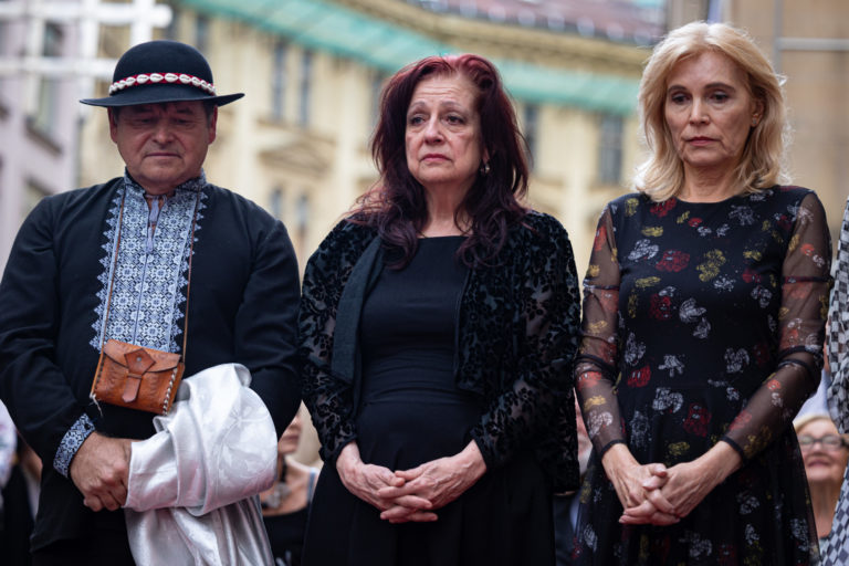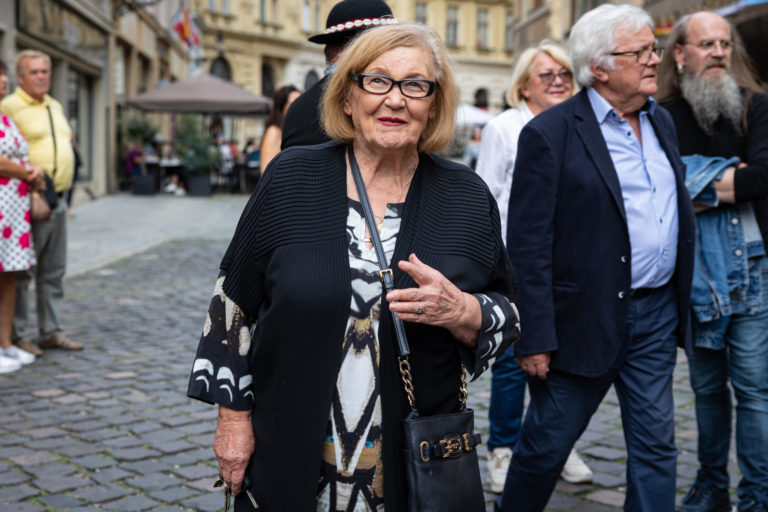 Slovenská herečka, filmová producentka a manželka zosnulého režiséra Juraja Jakubiska Deana Horváthová-Jakubisková (uprostred) počas slávnostného odhalenia dlaždice Jurajovi Jakubiskovi na Filmovom chodníku slávy. Bratislava, 22. september 2023. Foto: SITA/Jana Birošová