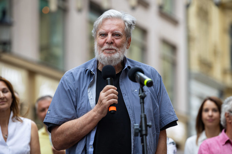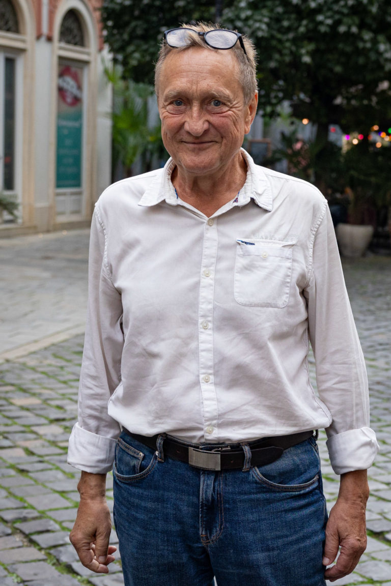 Slovenský spisovateľ Boris Filan počas slávnostného odhalenia dlaždice Jurajovi Jakubiskovi na Filmovom chodníku slávy. Bratislava, 22. september 2023. Foto: SITA/Jana Birošová