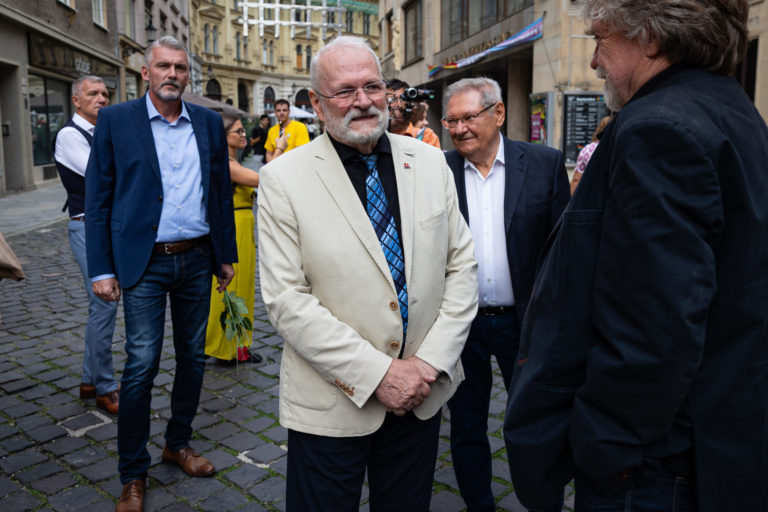 Bývalý prezident SR Ivan Gašparovič (uprostred) počas slávnostného odhalenia dlaždice Jurajovi Jakubiskovi na Filmovom chodníku slávy. Bratislava, 22. september 2023. Foto: SITA/Jana Birošová
