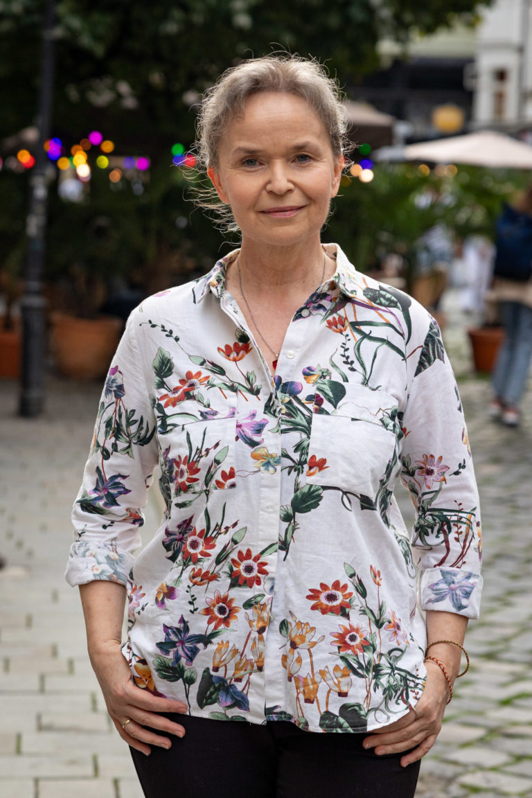 Slovenska herečka, filmová producentka a manželka zosnulého režiséra Juraja Jakubiska Deana Horváthová-Jakubisková počas slávnostného odhalenia dlaždice Jurajovi Jakubiskovi na Filmovom chodníku slávy. Bratislava, 22. september 2023. Foto: SITA/Jana Birošová