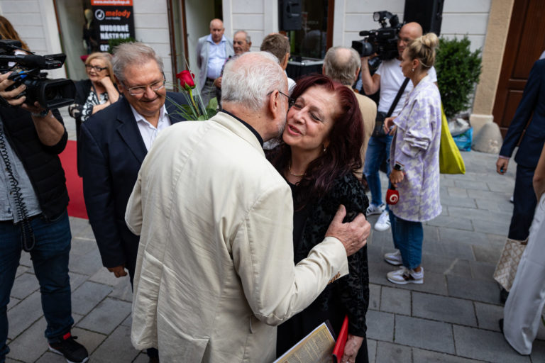 Sprava: Slovenská herečka, filmová producentka a manželka zosnulého režiséra Juraja Jakubiska Deana Horváthová-Jakubisková a bývalý prezident SR Ivan Gašparovič počas slávnostného odhalenia dlaždice Jurajovi Jakubiskovi na Filmovom chodníku slávy. Bratislava, 22. september 2023. Foto: SITA/Jana Birošová