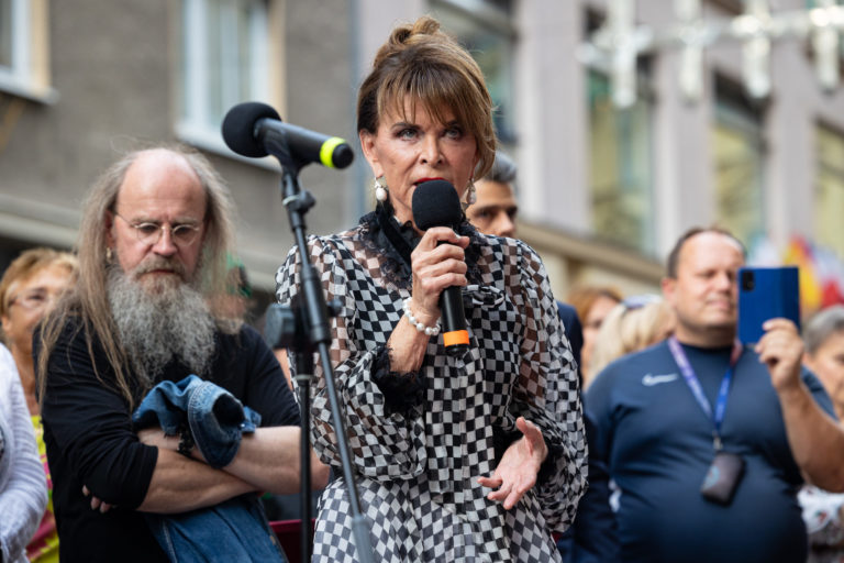 Slovenská herečka Zita Furková počas slávnostného odhalenia dlaždice Jurajovi Jakubiskovi na Filmovom chodníku slávy. Bratislava, 22. september 2023. Foto: SITA/Jana Birošová