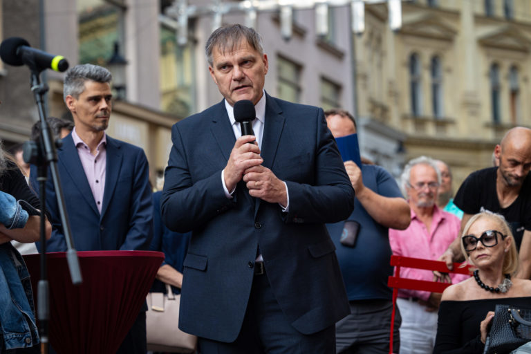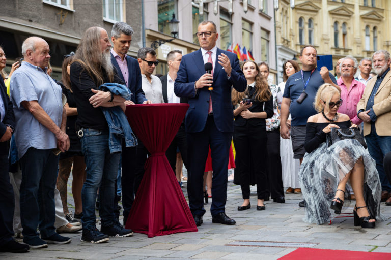Veľvyslanec Českej republiky na Slovensku Rudolf Jindrák počas slávnostného odhalenia dlaždice Jurajovi Jakubiskovi na Filmovom chodníku slávy. Bratislava, 22. september 2023. Foto: SITA/Jana Birošová