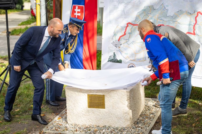 Minister obrany SR Jaroslav Naď (vpravo) počas odhalenia symbolického cieľového kameňa Cesty hrdinov SNP pod hradom Devín. Bratislava, 28. september 2022. Foto: archívne, SITA/Jana Birošová