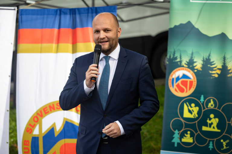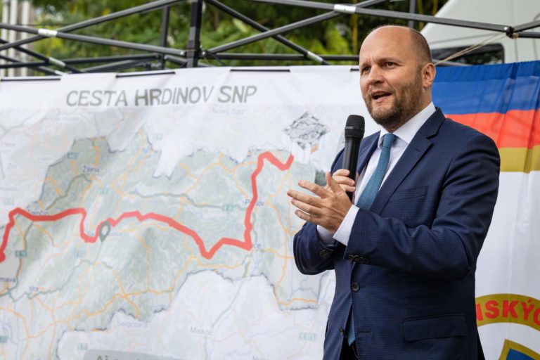 Minister obrany SR Jaroslav Naď počas odhalenia symbolického cieľového kameňa Cesty hrdinov SNP pod hradom Devín. Bratislava, 28. september 2022. Foto: SITA/Jana Birošová