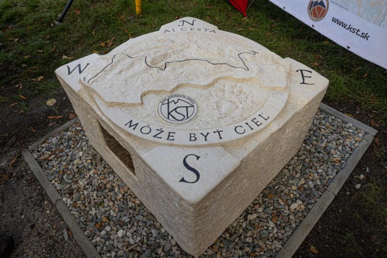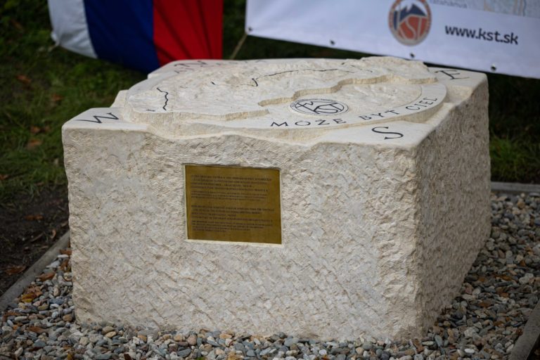 Symbolický cieľový kameň Cesty Hrdinov SNP počas svojho odhalenia pod hradom Devín. Bratislava, 28. september 2022. Foto: SITA/Jana Birošová