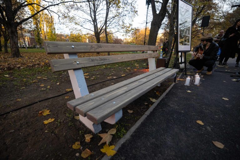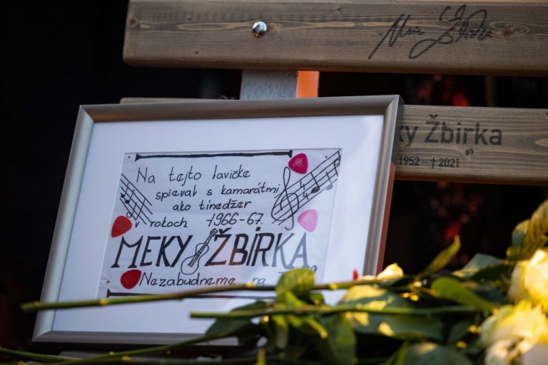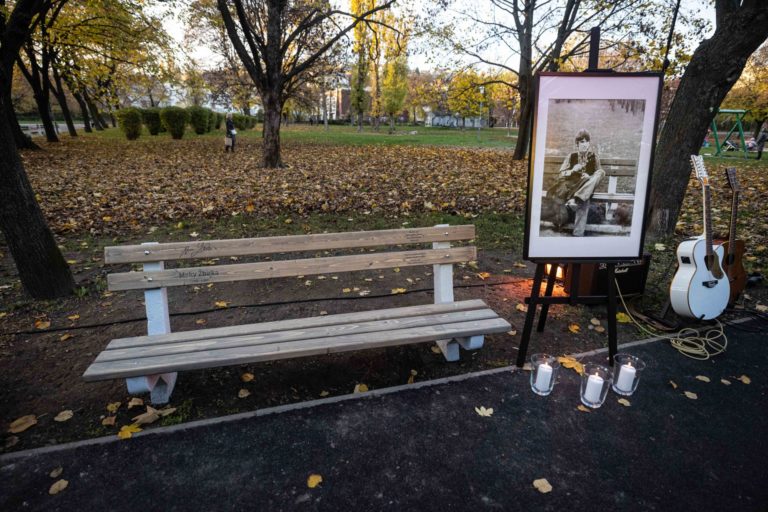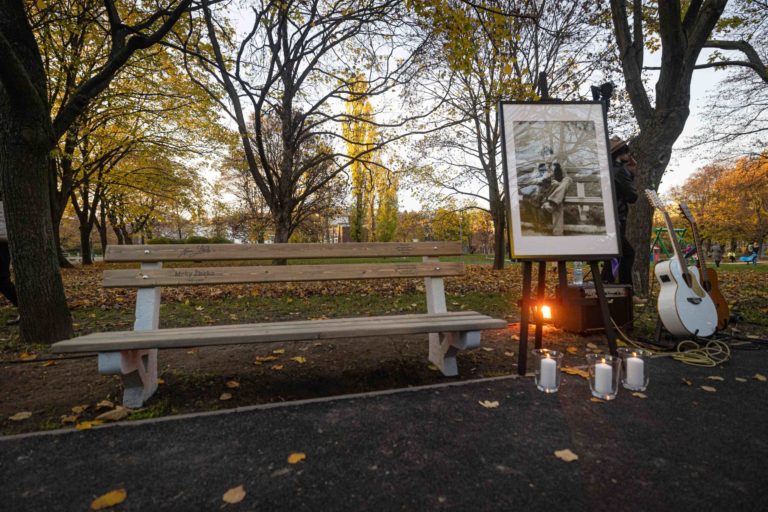 Odhalená lavička zosnulého slovenského speváka a hudobníka Miroslava Žbirku alias Mekyho v parku na Račianskom mýte v Bratislave. Bratislava, 11. november 2022. Foto: SITA/Jana Birošová