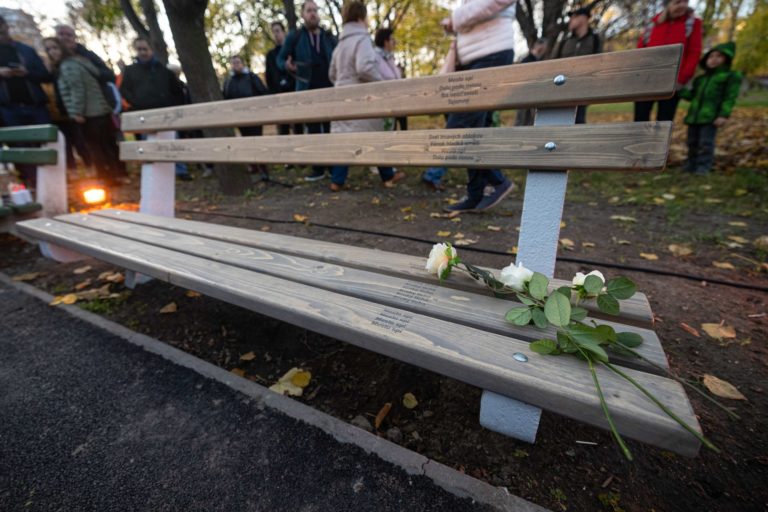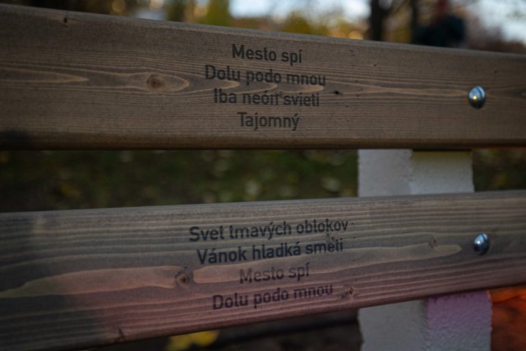 Detaily na odhalenej lavičke zosnulého slovenského speváka a hudobníka Miroslava Žbirku alias Mekyho v parku na Račianskom mýte v Bratislave. Bratislava, 11. november 2022. Foto: SITA/Jana Birošová