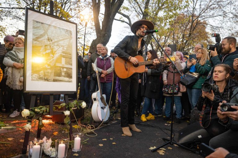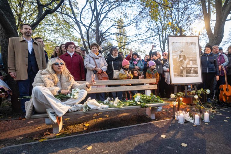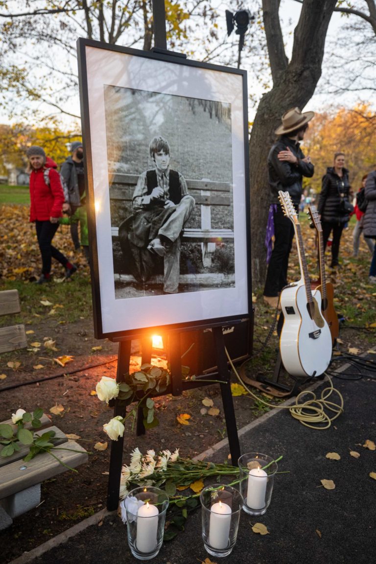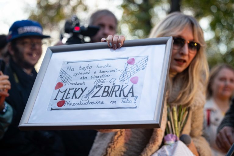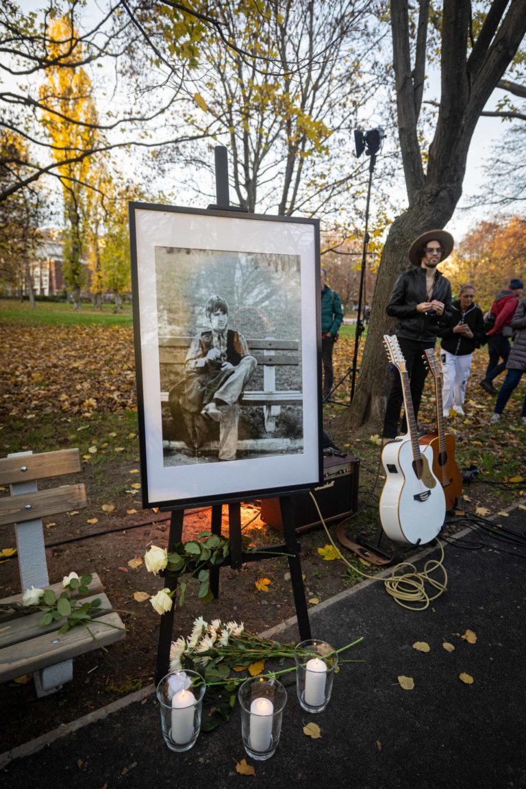 Atmosféra počas odhalenia lavičky zosnulého slovenského speváka a hudobníka Miroslava Žbirku alias Mekyho v parku na Račianskom mýte v Bratislave. Bratislava, 11. november 2022. Foto: SITA/Jana Birošová