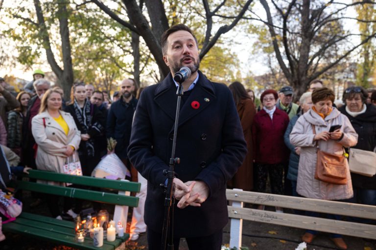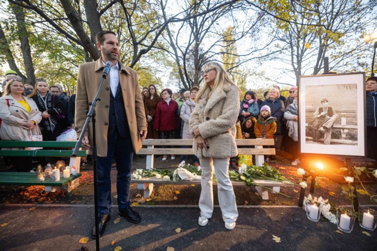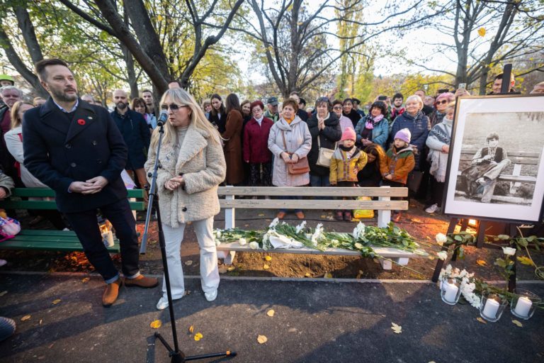 Zľava v popredí: Primátor Bratislavy Matúš Vallo a manželka zosnulého speváka Katka Žbirková počas odhalenia lavičky Miroslava Žbirku alias Mekyho v parku na Račianskom mýte v Bratislave. Bratislava, 11. november 2022. Foto: SITA/Jana Birošová