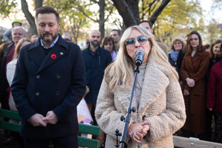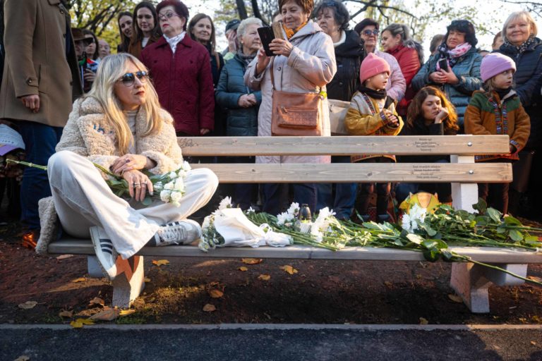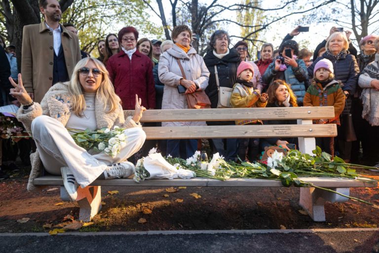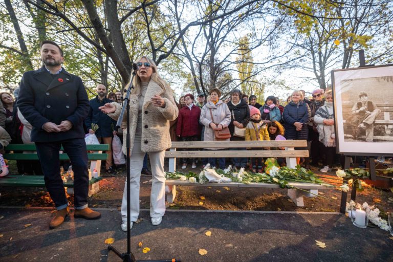 Manželka zosnulého speváka Katka Žbirková (vpravo) počas odhalenia lavičky Miroslava Žbirku alias Mekyho v parku na Račianskom mýte v Bratislave. Bratislava, 11. november 2022. Foto: SITA/Jana Birošová