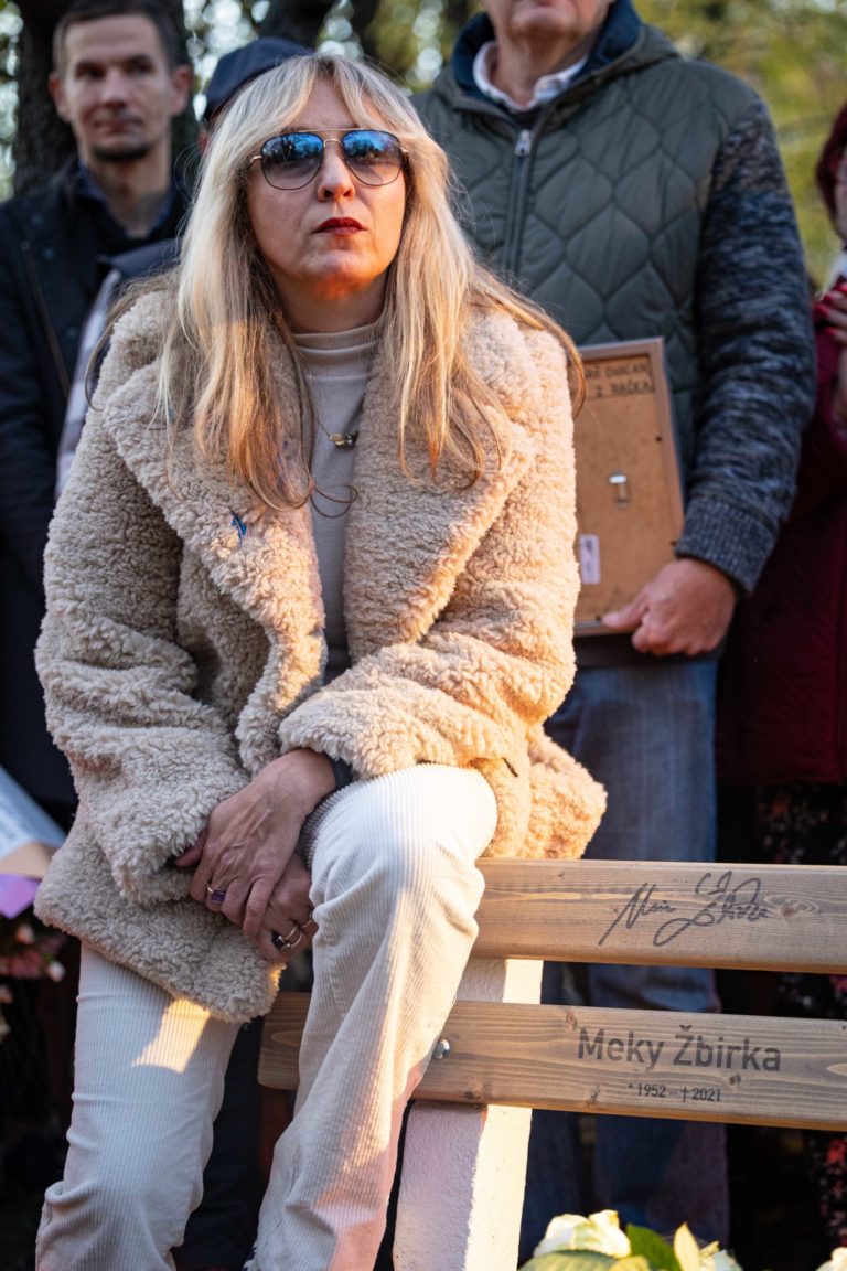 Manželka zosnulého speváka Katka Žbirková počas odhalenia lavičky Miroslava Žbirku alias Mekyho v parku na Račianskom mýte v Bratislave. Bratislava, 11. november 2022. Foto: SITA/Jana Birošová