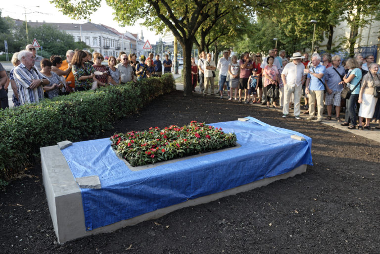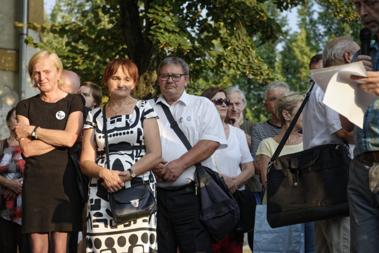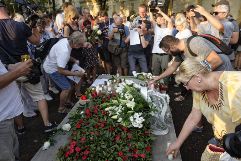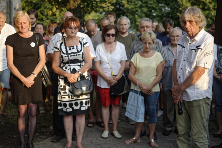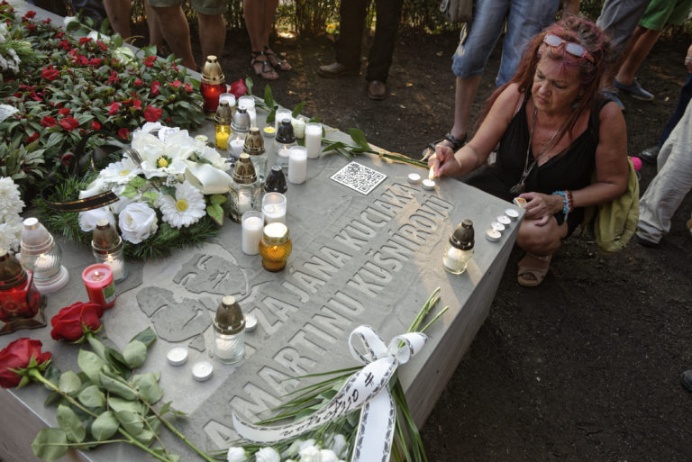 Smútiace rodiny zosnulých počas odhalenia pamätníka Jánovi Kuciakovi a jeho snúbenici Martine Kušnírovej v deň 50. výročia vpádu vojsk Varšavskej zmluvy do Československa. Pamätník mladej dvojice je umiestnený v parčíku na začiatku Južnej triedy, v blízkosti Kostola sv. Ducha v Košiciach. Košice, 21. august 2018. Foto: SITA/Ivan Fleischer
