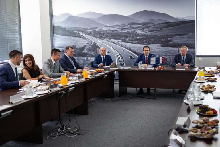 Predseda vlády SR Ľudovít Ódor (druhý sprava) počas kontrolného dňa v Národnej diaľničnej spoločnosti (NDS), ktorá v sídli na Dúbravskej ceste v Bratislave. Bratislava, 16. august 2023. Foto: SITA/Jana Birošová