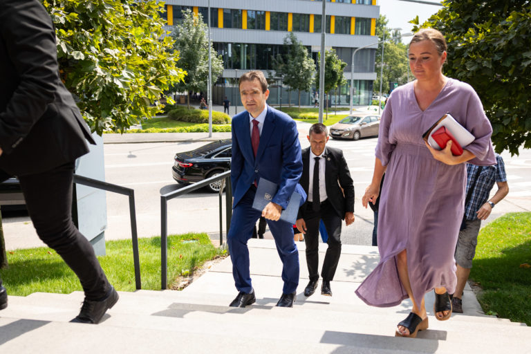 Predseda vlády SR Ľudovít Ódor (v popredí vľavo) počas príchodu na kontrolný deň v Národnej diaľničnej spoločnosti (NDS), ktorá v sídli na Dúbravskej ceste v Bratislave. Bratislava, 16. august 2023. Foto: SITA/Jana Birošová