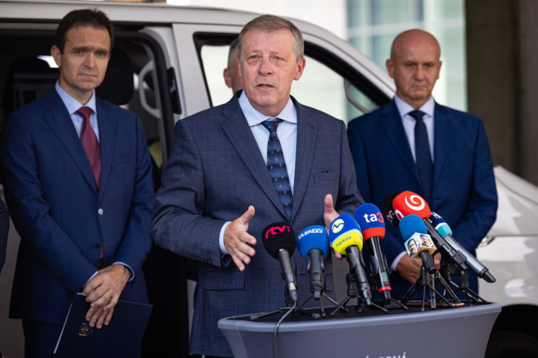 Predseda vlády SR Ľudovít Ódor (druhý zľava) počas tlačového brífingu v rámci kontrolného dňa v Národnej diaľničnej spoločnosti (NDS), ktorá v sídli na Dúbravskej ceste v Bratislave. Bratislava, 16. august 2023. Foto: SITA/Jana Birošová
